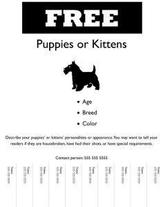 The dangers of “Free to Good Home” ads aside…this is just a scary little picture of how pervasive the idea of “animal as object” is in our society.  It’s so thoroughly ingrained that someone thinking I need to make a sample flyer with tear-off strips immediately came up with “giving away unwanted animals” as a subject for their sample flyer.